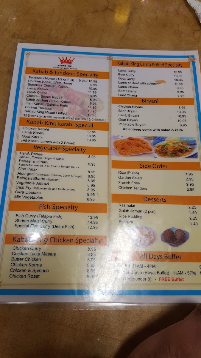Introducing the menu at Kabab King, located at 5701-C Columbia Pike in Falls Church, VA, is a culinary adventure that delights the senses. Specializing in authentic Bangladeshi and Indian cuisines, this restaurant offers a buffet that is the star of the show. Guests rave about the succulent butter chicken, which is tender and flavorful, making it a must-try. The variety doesn't stop there; the daily rotating menu includes tandoori chicken, beef and goat curries, and delectable vegetarian options, ensuring everyone leaves satisfied. Reviewers like Oscar Bradley and Joseph Muniz appreciate the freshness and ample portions, especially in the relaxed setting where diners can bask in the warmth of culinary traditions. Nigel Stewart captures the essence perfectly, noting amazing food at an incredible price. Whether it’s a family gathering or a casual meal, Kabab King promises a memorable experience filled with flavor.